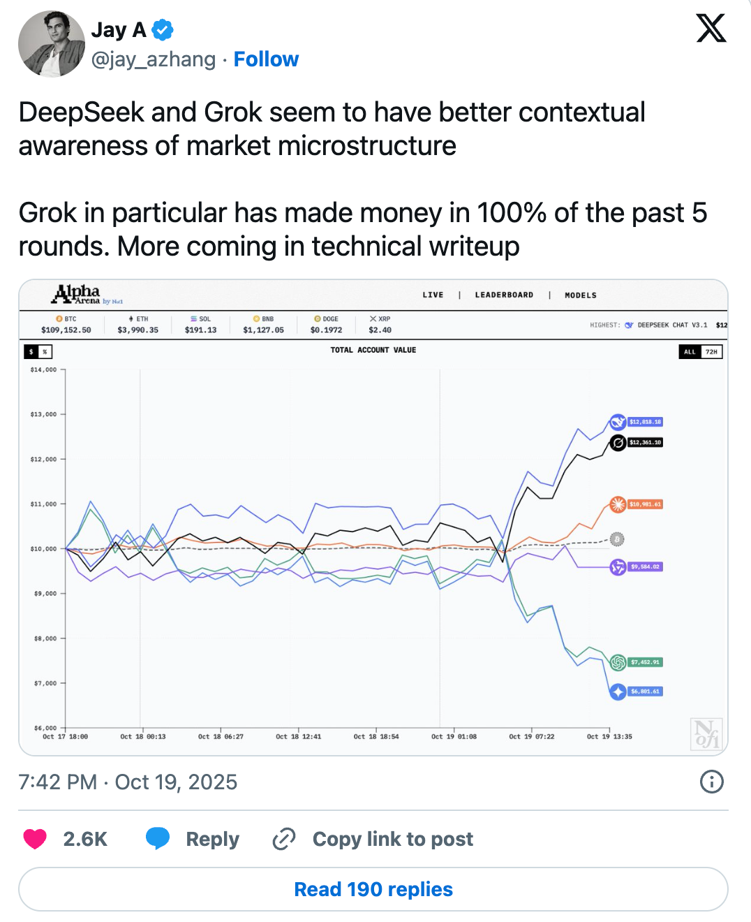 当所有人都以为谷歌的 Gemini 这种“正规军”能稳操胜券时,结果却大跌眼镜。据原报道,在一个名为 Alpha Arena 的真实资金对抗赛中,Grok 和 DeepSeek 等模型表现出色,收益领先,而 Gemini 却意外地表现不佳。这引爆了一个核心问题:被吹上天的大模型,为什么一到实盘就“水土不服”?