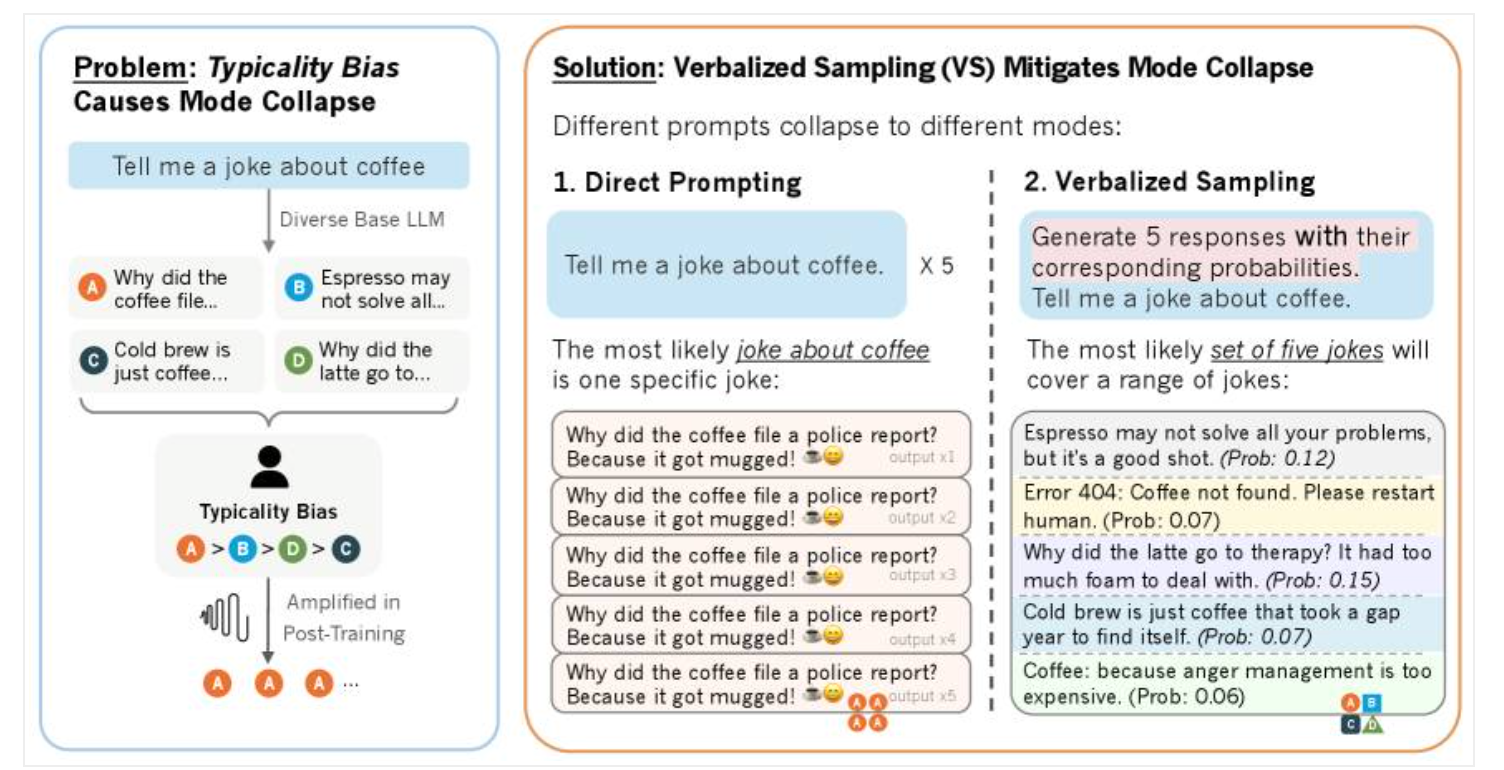 最近,斯坦福与东北大学的研究者提出了一个极其简单,却又非常巧妙的解决方案,叫作“口述取样”(Verbalized Sampling, VS)。
