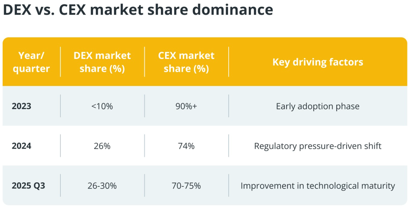 让我们再次审视这个核心数据:全球永续合约市场的份额,从2023年底的2.7%增长到2025年中的26%。 这意味着在短短一年半的时间里,超过四分之一的期货交易量已经从币安、OKX等传统巨头流向了这些无需KYC、用户自托管的去中心化平台。这不仅是数字的增长,更是用户行为和信任的根本性迁移。它表明,当去中心化产品提供了足够好的用户体验时,市场会用脚投票。